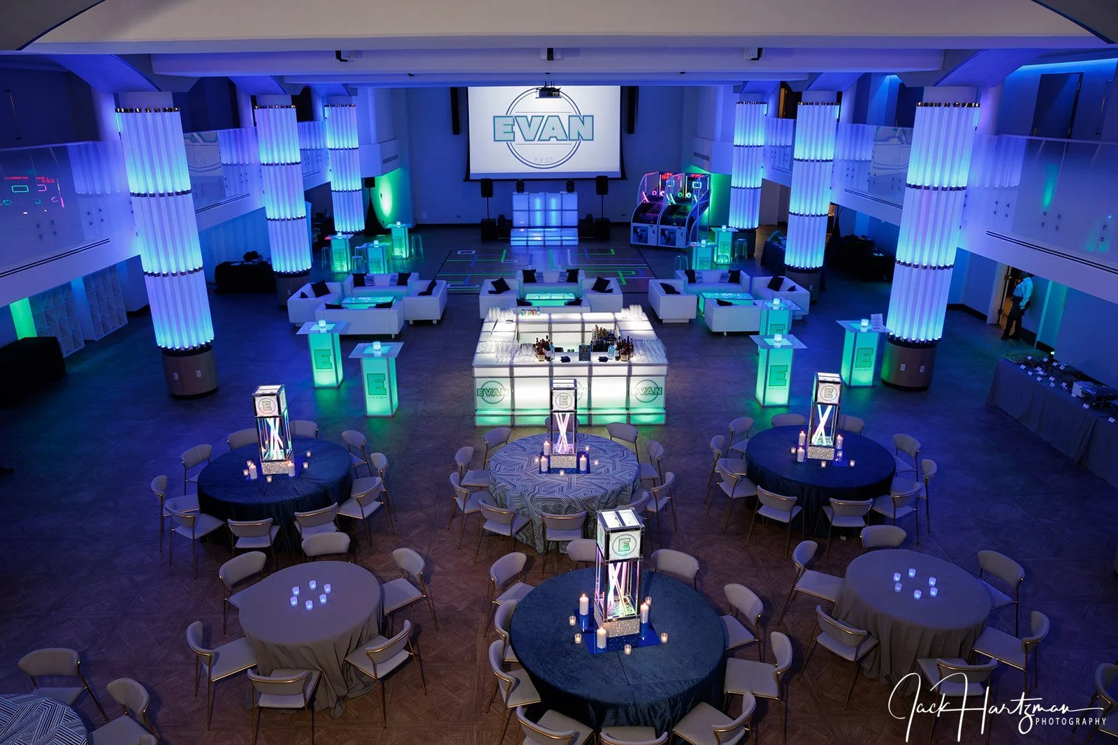 The dj area is the central focal point of your entire event. Usually it’s in the middle of the room, therefore making it automatic area the eye is drawn to. Not only is the DJ the physical focal point of the room, but that is where the event is being run from. Every announcement, dance, the hora, blessings- that’s happening will be happening in front of the dj- making it a prime spot for a photo op. I’d say at least 70% of the pictures you’ll have from the night will be in that area, so make it count!